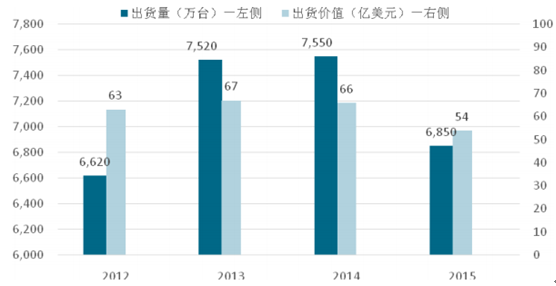 近四年來全球移動存儲出貨量總體上保持穩定,在經歷 2013年、2014 年連續兩年增長后,2015 年全球個人及入門級存儲總出貨量及出貨價值出現了小幅下滑,分別為 6,850 萬臺及 54 億美元 ,出貨量相比 2014 年減少約 9.2%。