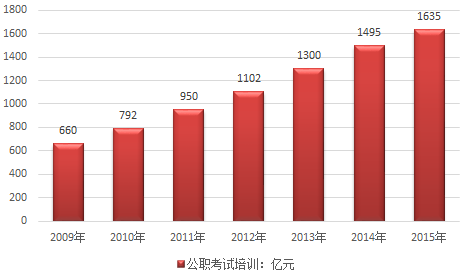 核心提示:公務員考試是目前國內公眾影響力僅次于高考的社會性考試。2009年我國公務員考試培訓市場規模僅為660億元,2015年市場規模達1635億元。復合增長率達24.6%。2009年-2015年公務員考試培訓市場規模數據來源:公開資料整理2010年公務員考試是目前國內公眾影響力僅次于高考的社會性考試。2009年我國公務員考試培訓市場規模僅為660億元,2015年市場規模達1635億元。復合增長率達24.6%。