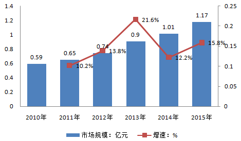 2010-2015年我國綠藻行業市場規模:億元,%