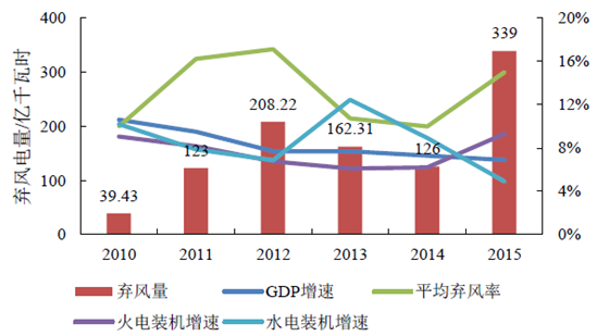 2010-2015年我國棄風率及GDP 變化情況
