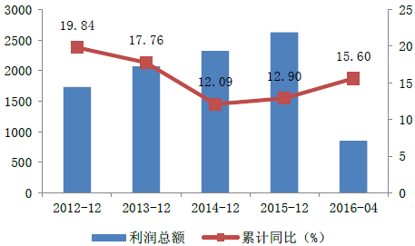 2012-2016年中國醫藥制造業利潤總額變動情況
