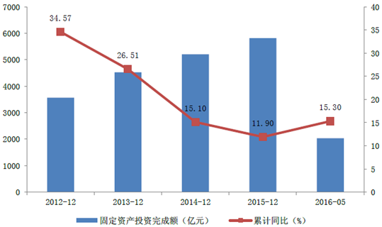 2012-2016年中國醫藥制造業固定資產投資完成額