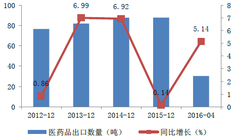 2012-2016年中國醫藥品出口量情況