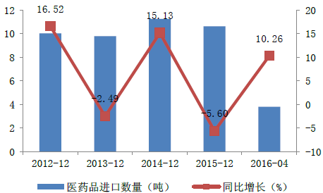 2012-2016年中國醫藥品進口量情況