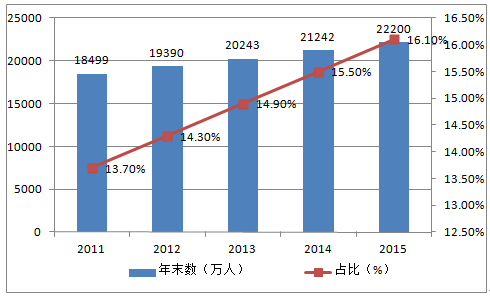 2011-2015年中國60歲以上人口數量變化情況