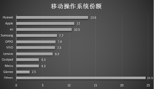 Rankings201420152016companyMarket sharecompanyMarket sharecompanyMarket share1Samsung27.8%Samsung24.8%Samsung22.2%2Apple16.4%Apple17.5%Apple16.8%3Lenovo+Motorola7.9%Huawei8.4%Huawei9.3%4Huawei6.2%Xiaomi5.6%Lenovo6.1%5LG5.4%Lenovo5.4%Xiaomi5.8%6Xiaomi5.2%LG5.3%LG5.0%7Coolpad4.2%TCL4.0%TCL4.0%8Sony3.9%OPPO3.8%OPPO3.9%9TCL3.3%BBK/VIVO3.3%BBK/VIVO3.4%10ZTE3.1%ZTE3.1%ZTE3.1%others16.6%others18.8%others20.3%Shipment Total(Unit;M)1172.31292.71397.1面對不斷壓縮的利潤空間,智能手機行業進入了一個極其艱難的處境,國內大部分廠商僅僅完成了手機的設計、制造、組裝、銷售與售后等環節,主要芯片等原件與操作系統仍然壟斷在其他廠商手中。大打價格戰使智能手機市場成為一片死海。即便是在競爭如此激烈的環境下,大量入局者使競爭環境進一步惡化,通過斗價格,比跑分,賽配置,看營銷,講情懷,做宣傳的方式競爭,已成為行業發展的固定模式。