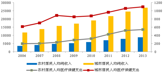 城市、農(nóng)村居民人均純收入及醫(yī)療保健支出情況