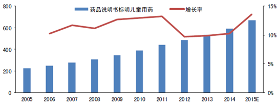 3、當前兒童醫療領域具有持續性增長力,體現在用藥和門診兩方面:在用藥方面,2014年兒童用藥市場規模已達590億元,2005-2014 年的復合增長率約為11.30%,據南方醫藥經濟研究所的預測,2015年我國兒童藥銷售額將達到670億元;在門診方面,《2014中國衛生統計年鑒》顯示2013年兒童門診接待近2億人次,兒童醫院病床使用率103%,每床出院人數47.8,病床周轉次數達49.3,在所有衛生機構中最高。