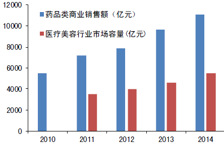 2010-2014年中國醫療器械、保健品、健身房市場規模