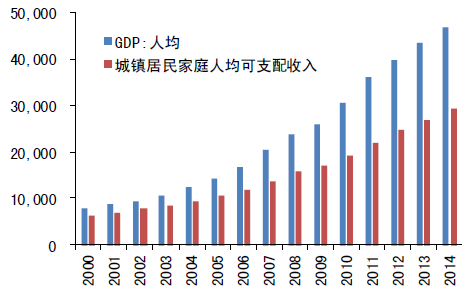 我國居民收入的提升為大健康產業發展奠定了購買力基礎。國際發展經驗顯示當人均GDP超過6000美元時,進入典型的消費升級周期,非生活必需品消費將成為主。2011年以來,我國人均GDP超過6000美元,居民可支配收入持續增長,從2008年15,780元增加到2014年29,381元。伴隨收入增加,居民醫療消費支出保持較高速增長,2011至2014年,城鎮居民醫療保健類支出年均增長率為10.66%,高于居民消費性支出10.35%的增速,且近年來呈現明顯上升趨勢,2014年醫療保健類支出增速為14.91%,大幅高于8.01%的消費性支出增速與8.98%的居民可支配收入增速。