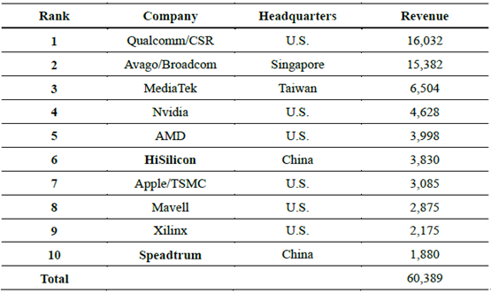 海思和展訊成為全球前十大IC 設計企業(單位:百萬美元)