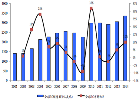 2001-2014年全球IC銷售額及增速