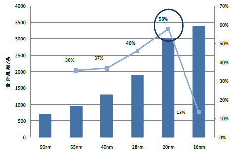 晶體管結構變化提升技術難度。28nm 之下,晶體管基礎結構的顛覆性變化導致了設計、制造、封測和裝備材料整條產業鏈技術復雜的大幅提升。以制造為例,從28nm 到20nm,代工廠的節點設計規則和設計規則檢查用面積分別上升了58%和95%,遠超之前和之后的制程。技術難度提升是制程演進放緩的基礎因素。