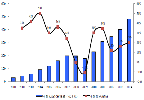 2001-2014年中國大陸IC銷售額及增速