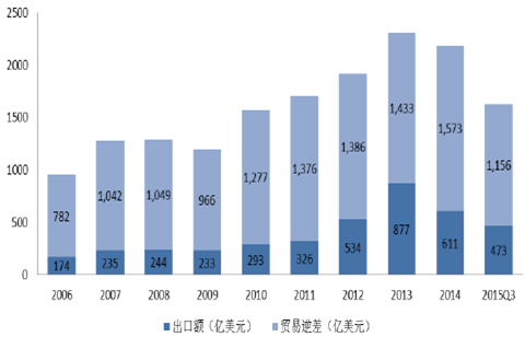 2006-2015年中國芯片出口額及貿易逆差