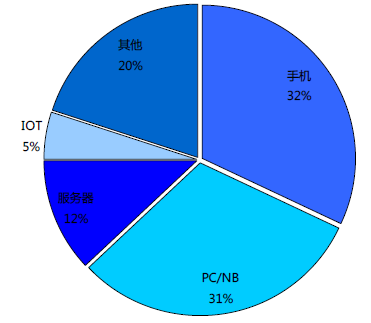 云計算、物聯網,兩大增量市場在大陸。2014年DRAM 下游應用,移動互聯網終端占比接近70%;服務器、物聯網設備等占比約30%。2014 年NAND Flash 下游需求移動互聯網終端占比近80%。市場可能擔心智能手機滲透率已經很高,行業增速放緩,存儲芯片下游需求增長堪憂。我們認為:短期內,移動終端出貨量增速放緩確實影響存儲芯片需求增速,但流量爆發下的云存儲設備、物聯網新終端和區塊鏈正加速爆發,有望形成新的需求增長點。
