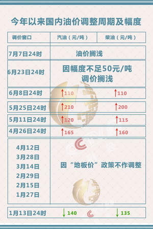 而今年以來,國內成品油已經歷12次調價窗口,其中4次上調,1次下調,7次不作調整。據卓創資訊測算,漲跌互抵后,汽油零售限價累計上調0.34元/升,柴油累計上調0.39元/升。