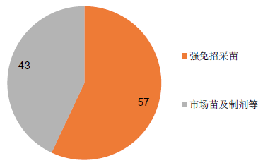 目前我國主要的強(qiáng)制免疫招標(biāo)的疫苗有四種:口蹄疫,禽流感,豬藍(lán)耳病和豬瘟。2015 年動物疫苗市場規(guī)模約100 億,其中強(qiáng)免疫苗占57 億,非強(qiáng)免疫苗占43 億。其中豬用疫苗為54 億元,禽用的為35 億元,牛羊用的為8 億元,寵物等其他2 億。豬疫苗中強(qiáng)免疫苗占到了整個豬用疫苗的67%,禽用強(qiáng)免苗占據(jù)了禽用市場的40%。