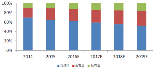 2014-2019年傳統IT、公有云、私有云投入比例測算