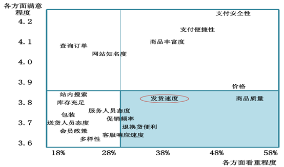 據調查顯示,影響消費者網購行為由多重因素導致,包括了網頁、支付、物 流和售后等。其中,除了商品質量和價格,發貨速度成為消費者最為看重的條件。但是由于消費者的滿意度不高,電商在物流服務方面的提升空間還很大。