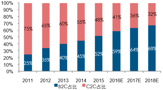 隨著線上 C2C 和 B2C 平臺逐 步完善,消費者的線上購買依賴性增強,線上交易規模獲得快速增長,而在此趨勢下, 線下品牌商和實體零售商為拓寬客戶消費渠道,在 2010 以后紛紛尋求觸網,品牌官網和 O2O 商城逐步推出。面對線上積累的巨大消費人群,品牌商和線下實體商觸網動力 強勁。2010 年以后中國網購零售市場 B2C 占比迅速提升,2015 年 B2C 市場規模達到 2 萬億,同比增長近 60%,占網購市場規模達 53%,預計 2016 年國內網購 B2C 市場 占比將進一步提升。
