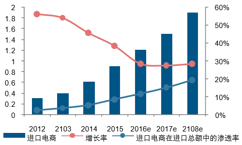 進口電商的滲透率不斷增加(萬億元)