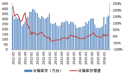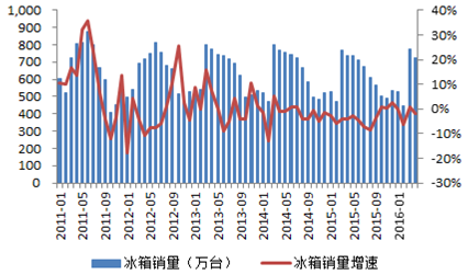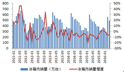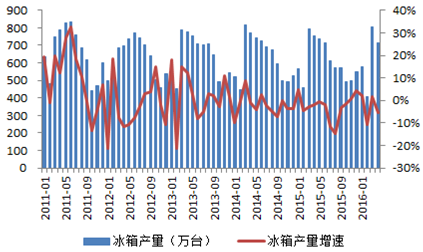 核心提示:2016年1-4月冰箱總產量為2508萬臺,同比下滑2.56%,總銷量為2468萬臺,同比下滑1.43%,其中冰箱出口量累計781萬臺,同比增長5.53%;冰箱內銷量累計1687萬臺,同比下滑4.36%。2011-2016年中國冰箱產量及增2016年1-4月冰箱總產量為2508萬臺,同比下滑2.56%,總銷量為2468萬臺,同比下滑1.43%,其中冰箱出口量累計781萬臺,同比增長5.53%;冰箱內銷量累計1687萬臺,同比下滑4.36%。