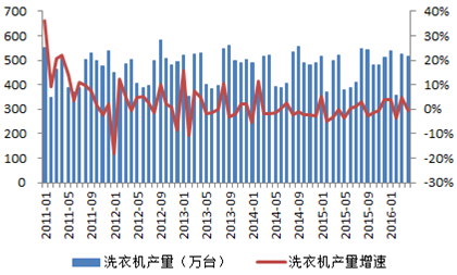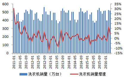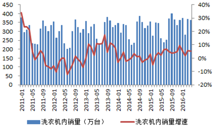 核心提示:2016年1-4月洗衣機行業總產量1932萬臺,同比增長1.52%;總銷量1949萬臺,同比增幅3.44%。其中內銷出貨量1385萬臺,同比增長4.7%,出口出貨量564萬臺,同比微增0.5%。2011-2016年中國洗衣機產量及增速2012016年1-4月洗衣機行業總產量1932萬臺,同比增長1.52%;總銷量1949萬臺,同比增幅3.44%。其中內銷出貨量1385萬臺,同比增長4.7%,出口出貨量564萬臺,同比微增0.5%。