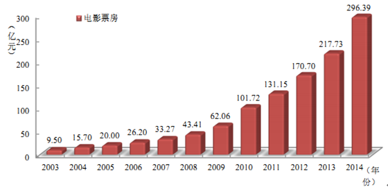 2014 年中國電影市場總票房為 296.39億元,比 2013 年增加了 78.66 億元,增速達 36.12%。中國已成為僅次于北美的全球第二大電影市場。
