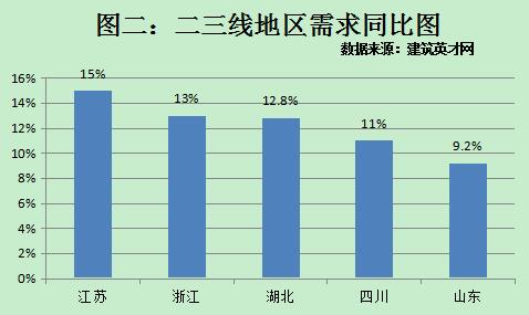 土地熱潮必然帶動人才市場的火爆。建筑英才網數據顯示,截至2016年6月,全國范圍內,建筑人才需求同比上漲7.5%;一線地區北京、上海、廣東建筑人才需求同比分別上漲8.9%、11.5%、12.6%;二三線地區中,江蘇、浙江、湖北、四川、山東等招聘需求同比分別上漲15%、13%、12.8%、11%和9.2%。