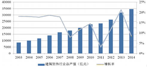 我國建筑裝飾行業2014年的總產值約為3.46萬億元,較2003年的8,500億元增長了307.06%,年均復合增長率達到13.61%,保持快速的增長。