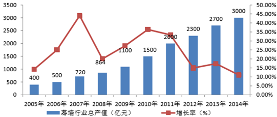 2005-2014 年我國建筑裝飾行業總產值及增速