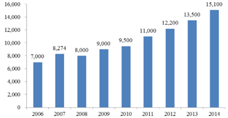 2006-2014 年全國住宅裝飾市場規模(億元)