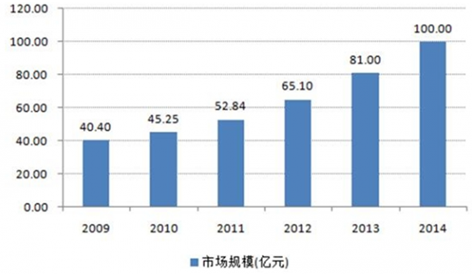 2009-2014年我國城市軌道交通市場規模(單位:億元)