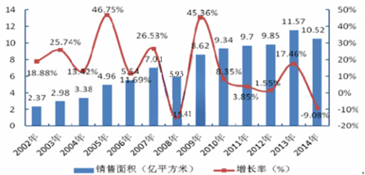 產開發企業到位資金 125,203 億元,比上年增長 2.6%。2002-2014年中國商品房住宅年銷售面積和增長情況