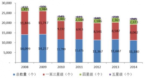 隨著我國經濟快速增長,商務差旅活動需求不斷擴大,居民生活水平的逐漸提高帶來了消費升級以及越來越多的出游需求。根據 2004 年、2013 年《中國星級飯店統計公報》的數據顯示,國內星級飯店數量在 2004 年至 2013 年期間保持穩定的增長,其中五星級飯店復合增長率達 13.21%,四星級飯店復合增長率達到 10.39%,三星級飯店復合增長率達 4.12%。根據邁點旅游研究院對國內酒店開業情況的不完全統計,2013 年國內開業的酒店(三星級標準以上)數為 188 家,其中五星級標準酒店開業數量占全國開業酒店的四分之三,截至 2013 年底,我國星級酒店已多達 11,687 家,其中五星級酒店數量為 739 家、四星級 2,361 家、三星級 5,631 家。根據瑞銀證券于 2012 年 5 月 17日發布的《中國建筑裝飾行業》