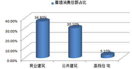 從市場應用看,隨著中國城市化進程的快速推進,數量龐大的大型公共建筑、商業樓宇及高端住宅不斷涌現,是近年來中國建筑幕墻需求快速增長的重要原因。從2013年的幕墻招標統計信息看,商業建筑在中國幕墻消費總額中占比最大,約占66.80%;其次是公共建筑,約占30.10%;高檔住宅占比最小,約為3.1%。