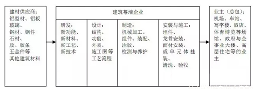 在產業鏈上,幕墻企業介于建筑業主(或建筑總包)與建材供應商之間,其下游的業主對大型建筑工程的投資建設決定了建筑幕墻的市場需求,總包則負責建筑主體工程建設并協調相關專項分包商,對幕墻企業有重要影響;其上游則是鋁型材、玻璃、鋼材、石材、膠等各類建材企業。綜合性的建筑幕墻企業除了具有施工企業的一般特點外,還具有輕型機械制造企業和設計院的基本特征,幕墻行業也因此成為建筑業里最具技術含量的產業,其與上下游的產業關聯關系表示如下: