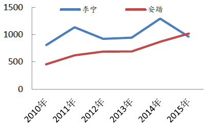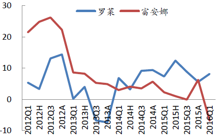 2012-2016年羅萊家紡、富安娜收入增速情況