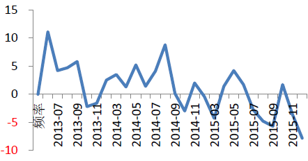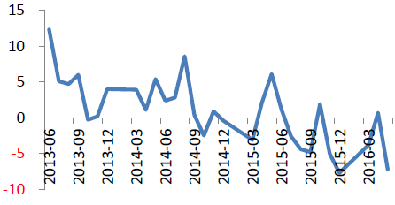 2013-2016 年全國百家重點大型零售企業服裝類商品零售額分月同比增速(%)