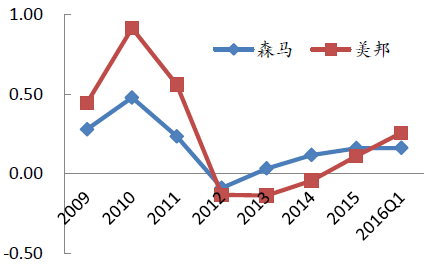 棉花供給縮緊,需求穩中有升。供給層面上,棉花供給縮緊。棉農的種植意愿繼續回落趨勢,根據2016 年3 月的意愿調查顯示,全國意向種植棉花減少9.4 個百分點,比上年同期減幅下降了12 個百分點;產銷下降,據國家棉花市場監測系統的數據顯示,截止6 月17 日,全國累計加工皮棉506.6 萬噸,同比減少117.8 萬噸,較過去四年的正常年份減少205.6 萬噸;進口棉減少,據海關統計,2016 年5 月,我國進口棉花數量為7.82 萬噸,環比雖然增長12.1個百分點,但同比仍下降52%,2016 年前五個月累計進口35.77 萬噸,同比下降53.7%。從需求層面上看,內外棉持續縮窄差價將有利于國內的棉花需求;出口有所好轉,16 年5 月出口的增速下滑低于去年同期,且好于第一季度的整體水平,預計下半年的需求將會穩中有升,棉價將平穩且略有回升。