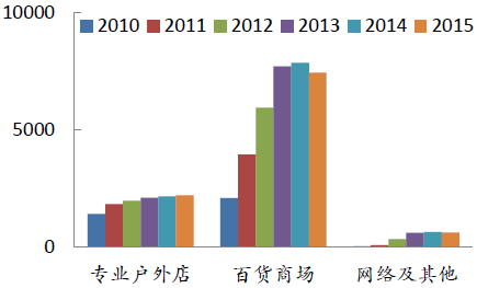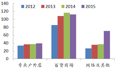 2012-2015年中國戶外行業分渠道零售額(億元)