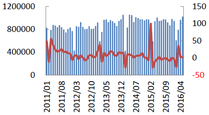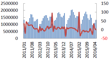 2011 -2016年服裝及衣著附件出口金額和分月同比增速