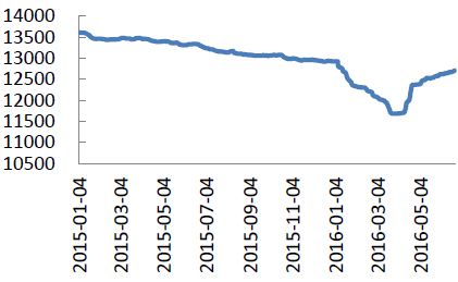 棉價觸底反彈,內外棉價差縮小。2016 年1-3 月,內棉價格持續下行,內棉價格在4 月初下降到近期最低點后開始反彈,截止到6 月21 日,內棉價格為12698 元/噸,相較于最低的價格上漲了8.7 個百分點。與此同時,以美元計價的Cotlook 指數在16 年第一季度下降之后也開始反彈,在人民幣匯率維持高位的情況下,以統一口徑計算的外棉價格居高不下,甚至一度高于內棉價格。5 月內外棉差價的幅度雖有波動但總體收窄,截止5 月20 日,內棉低于外棉的差價為242.5 元/噸。