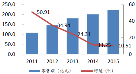 2009-2015年中國童裝行業零售額及增速(億元,%)