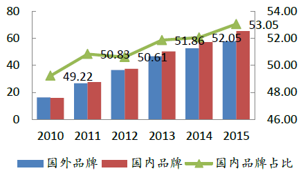 2010-2015年國內外戶外品牌出貨額及占比(億元,%)