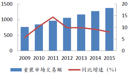 據測算,2009-2015 年我國童裝行業市場容量從763 億增至1372 億,2015 年的增長率為8%。隨著二胎的全面放開和消費升級,嬰童消費將會維持較高的景氣水平,預計至2017 年童裝市場規模將突破1500 億。