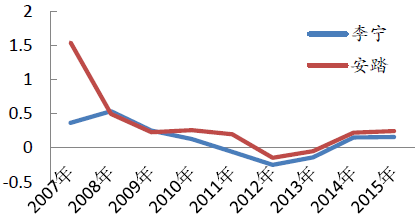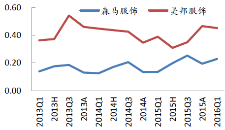 從收入端來看,休閑行業自2012 年起出現明顯下滑,歷經2 年時間,美邦服飾和森馬服飾旗下主品牌森馬均在2014 年后恢復正增長。從庫存端來看,美邦和森馬服飾庫存在2013 下半年出現一個小高峰后呈下降趨勢,在歷經波動后均出現不同程度的回升態勢,森馬服飾的庫存在2015 年第三季度出現高峰,美邦服飾的庫存高峰則出現在2015 年底。自15 年以來,森馬和美邦均在不同程度上存在著去庫存的壓力。雖然說營業收入同比有所回升,但是短期內仍復蘇乏力,企業持續表現分化。