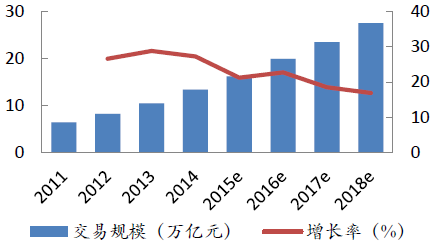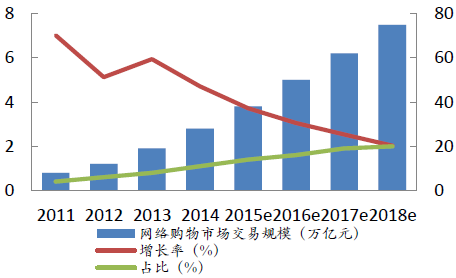 2011 -2018年國內網絡購物交易額、同比增速、占社零比重及預測(%)