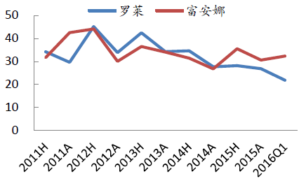 2011-2016年羅萊與富安娜存貨占流動資產比例(%)
